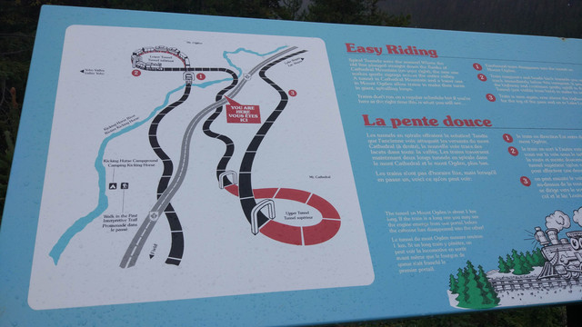 5、jasper出发原路折返,告别了城堡山、路易斯湖后向库克尼国家公园方向。一个观景台前聚集了很多人,不用说一定有的可看。Spiral Tunnels 8字隧道并不在我的行程中,这时一列载满集装箱的火车缓缓的驶来,列车五颜六色的,车厢出奇的多,车头穿过隧道后改变方向向左驶去。一会儿又穿过另一个隧道再次改变方向,能看到的火车车厢已经变成z字型排列,车头还在继续行走,车尾却仍未出现,神龙见首不见尾,车头消失在一片浓密的树林中。终于车尾出现了。这条长龙足足走了十多分钟。回身上车准备出发,车头忽然从我们身后的小山上再一次出现,太神奇了!