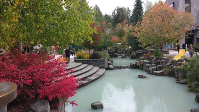 我们是纯游客,山下看看小勇士,街上逛逛小店。路边观观枫叶。世界各地的户外用品汇聚在这里的小店里。东西全,价格并不便宜。这里温度稍低,枫叶红的比市内早,但是不成规模。午餐时间,餐厅里挤满了人。多数人买份快餐坐着外边的长椅上,我们也入乡随俗。小镇建筑很美,四周都是山,自然环境很好。这种小镇欧美人最爱。