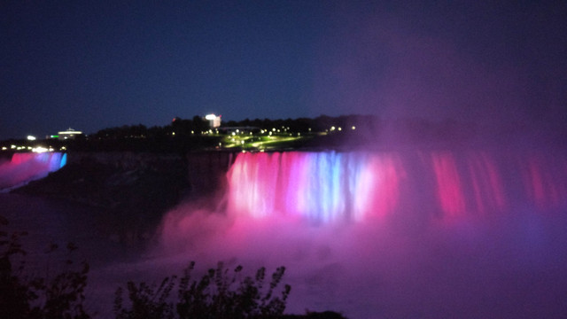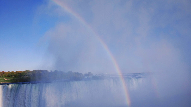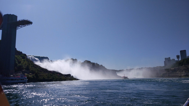 06年曾在美国那侧观赏过这个瀑布,水上的彩虹给我留下了很深的印象。那时报团参加了纽约到尼亚加拉大瀑布的2日游,并住在瀑布旁边。可是美国那里没有观览游船,观览的角度也不理想。这次坐船直面瀑布,穿着船上提供的红色雨衣,站在第一层甲板的船头。船开到瀑布前,我被扇形的水幕环绕着,水珠喷溅到身上,耳畔是雄壮的水帘降落入海的撞击声。气势磅礴,瀑布飞淌下落后腾空无数气雾。升腾的雾气在空中又与落下的水流交汇。置身其中感觉在欣赏交响乐。在大自然的交响乐中陶醉。夜幕下,游船停驶了,激光射灯把水幕装点成五颜六色。此时,激荡的水珠在霓虹中也变得柔美。白天的阳光给白色的瀑布点缀彩虹,而夜晚,灯光赋予水帘绚丽的色彩。白天和夜晚大瀑布的风格是不同的,但都是诱人的。