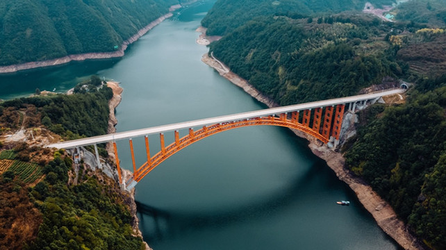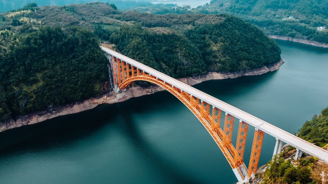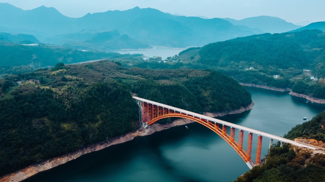 大桥采用 中国 最古老的石拱桥方式建造,主材料钢管结构,刚到桥上可能不觉得有多特别,当航拍飞起来的时候,这红色的钢筋结构绝对吸引你的眼球。