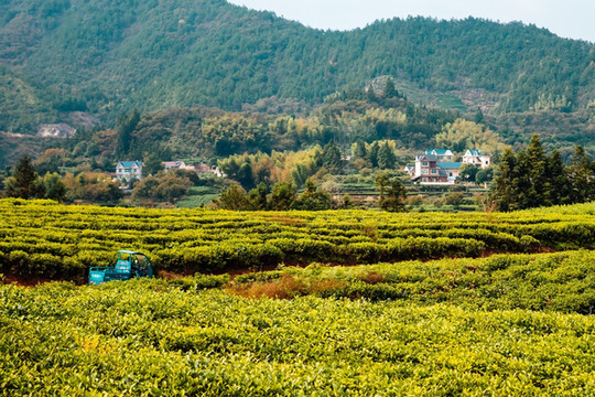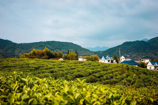 这座小村的楼房,基本都是白墙、蓝或红屋顶,从茶园看过去像是捉迷藏一样藏着。