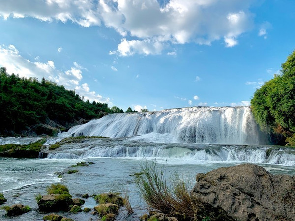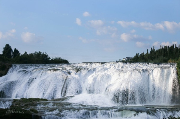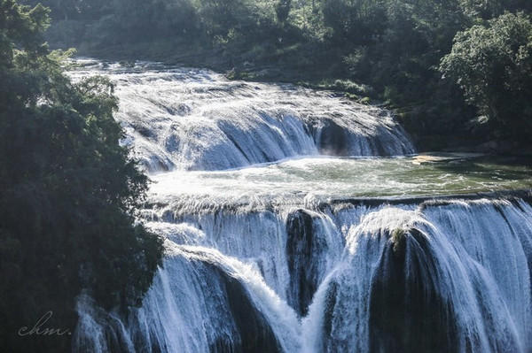 瀑布水层沿着和缓的瀑面,均匀地撒开,在一鳞鳞的钙华滩面上轻盈地舞着,如一层薄薄的、半透明的面纱,又如一面面张开的素绢扇面,在阳光下泛着银光,故有人戏称为"新娘面纱"。