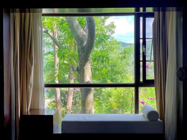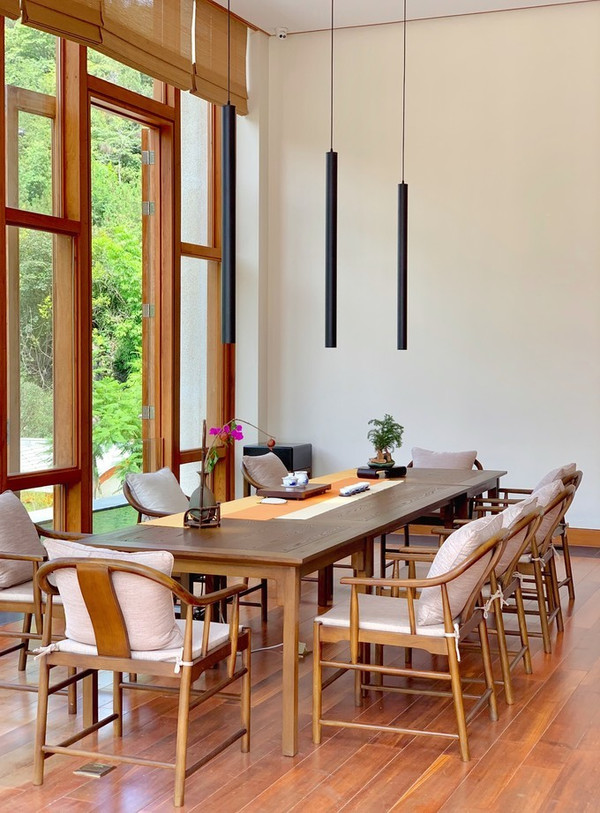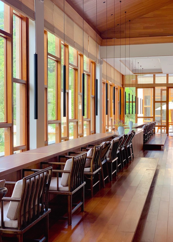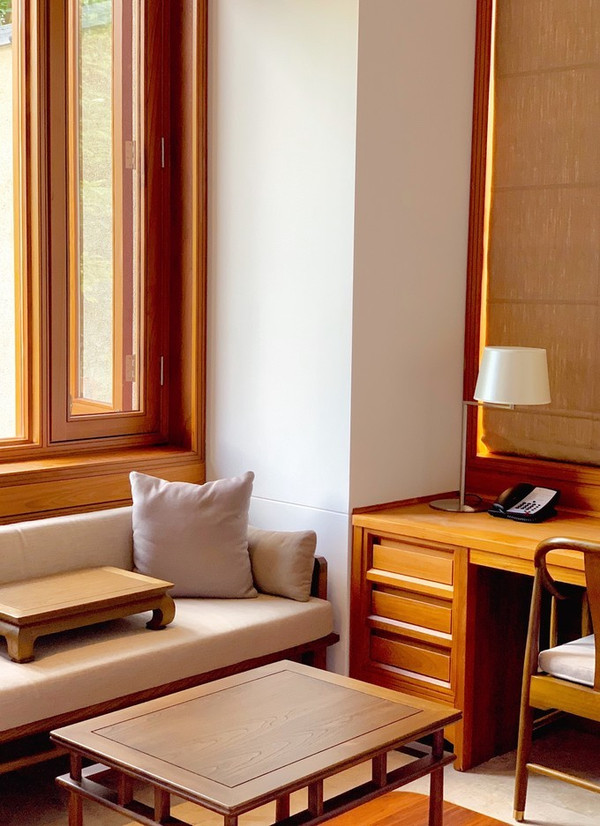 酒店为典型的新中式建筑,大量柚木的运用让整个色调简静明快,挑高的空间结构舒展而庄重,有着凝炼唯美的中国古典情韵。