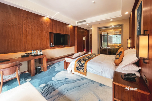 在暖色的灯光和实木沉稳的色调里,房间有着几分复古的奢华感。