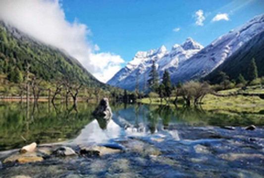 最后,就是海拔3800米左右的红杉林,这里可以是拍森系大片的宝藏拍摄地。很多小情侣都会选择,在这里拍一组森系合影。皑皑雪山下,密布着挺拔而笔直的红杉林,跻身其中犹如漫步东欧。除此之外,倘若时间充裕,不妨去四姑娜措看一看。冬日的四姑娜措一半是冰湖一半是枯枝,冰湖之上留下了雪山的剪影,令人叹为观止。整个湖掩映在高大的冷杉木和苍劲的沙棘树之间,犹如一片巨大的明镜。湖水清澈,枯木老树静立,显得一片静谧的神圣之美。
