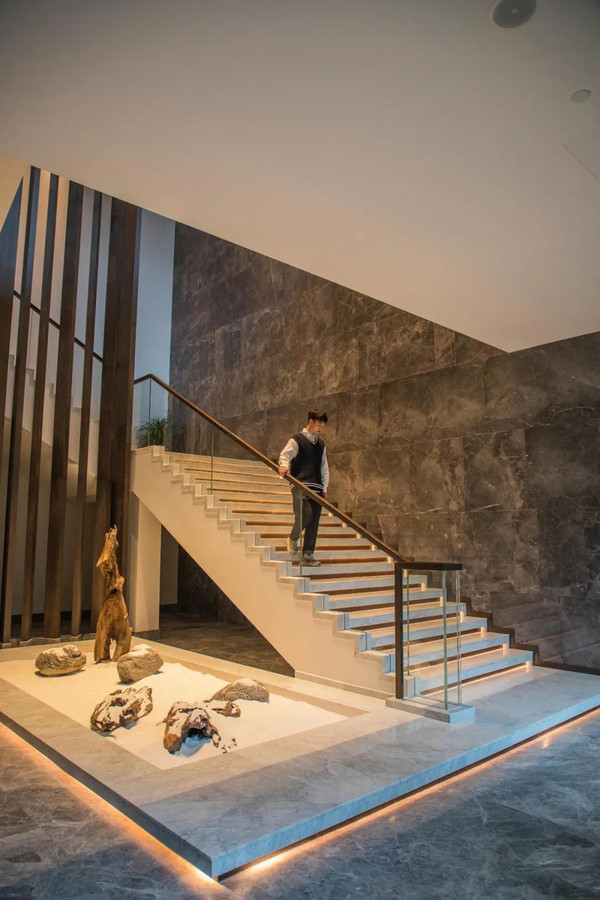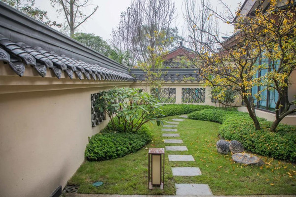 酒店的房间都是独栋别墅,每栋别墅都配有温泉。通往房间的院落里,被巧妙布置了花草山石,中式小景,与周边的自然景观融为一体,让人心境平和、超然物外。每一细节都以谦虚之姿态回应自然,寻求平衡妥帖之美。