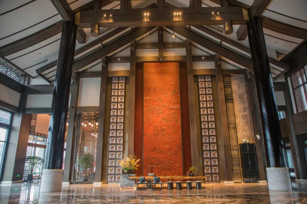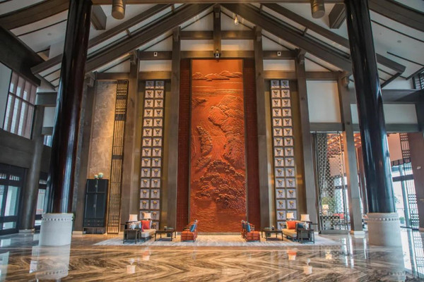 挑高的空间结构舒展而庄重,有着凝炼唯美的中国古典情韵。特别喜欢大堂三面透光的设计,让室外的景色也可以一览无遗。大堂正中由漆木雕画打造的背景墙讲述的是成都有关的历史,非常有特色。