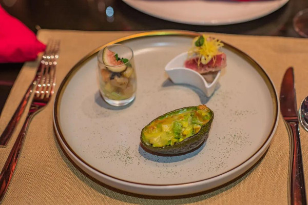 菜品的搭配和味道也很赞,餐前小吃是芝士焗牛油果和香煎吞拿鱼。