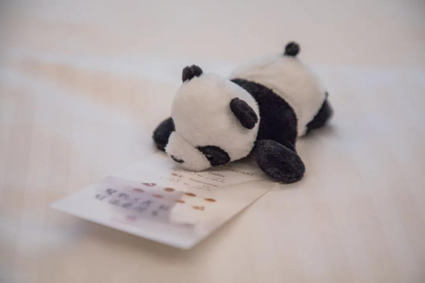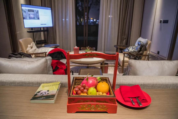每个房间的床上还被贴心的放置了具有成都特色的小熊猫玩偶。大红色仿古的提篮里有新鲜的欢迎水果,也是酒店用心的安排。