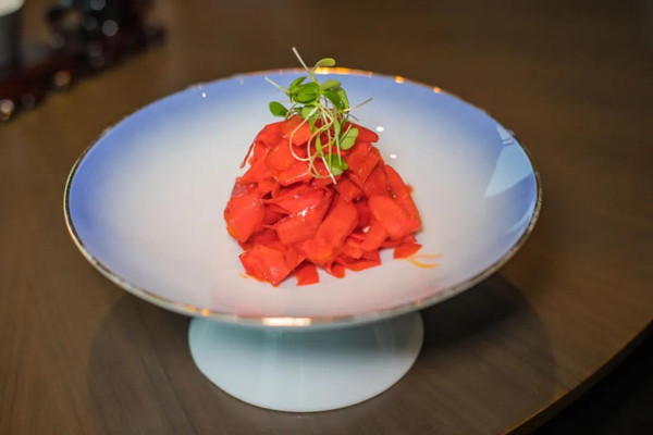 这道小味卜衣是升级版的泡菜。据说制作中每个萝卜只要第一层红皮,十斤萝卜才出一份菜,甘甜好味。