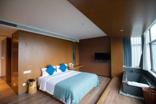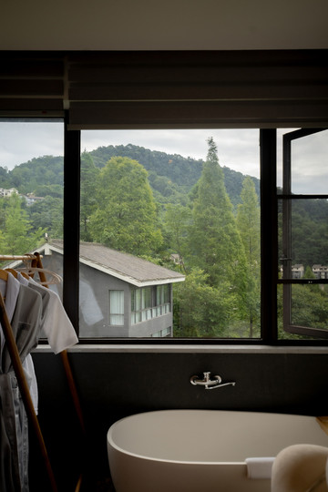 我的房间有一个浴缸在床的左侧,浴缸倚靠着一个面对树林的全景大窗,旁边是一个茶几。