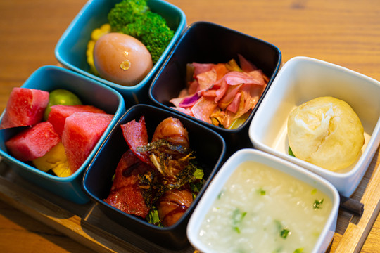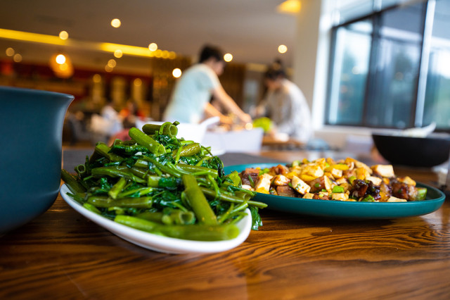 步行去大厅,踩几脚夜里的雨和落叶,吃一份早饭迎接山里的清晨。