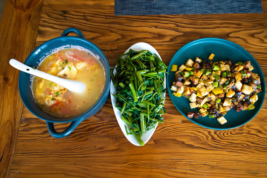 山里的鲜肉和切成碎片的笋子,新鲜的通菜,遨游在番茄里的鸡蛋。