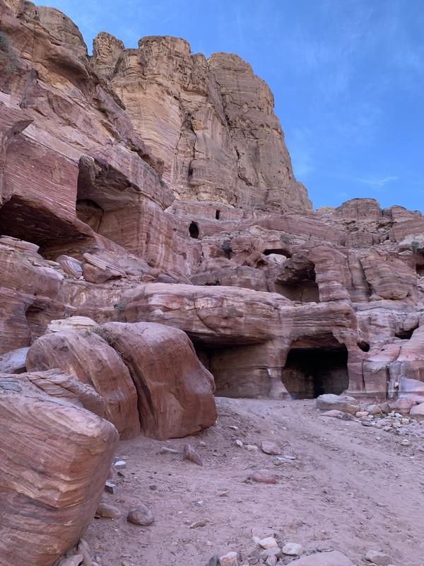 玫瑰色的岩石中凿出的洞穴。里面黑不隆咚的。不知道是给人住的还是给牲畜住的。