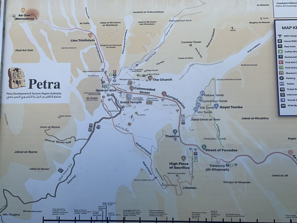 古城佩特拉的地图(部分)。一般观光客都是跟着导游走到"金库"拍拍照就回来的。那我是坚决要把本儿捞回来的那种人啊,一进古城就把导游甩了,一路狂奔,走遍the Siq,金库,墓穴,祭坛,罗马剧场,神殿,最后到了修道院(15)。刨去骑马的那一段,3小时半完成了14公里山路。
