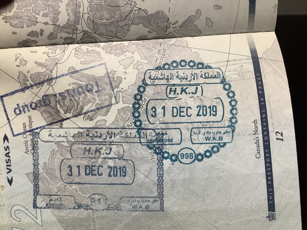 随团导游帮助办理进入约旦当日往返的落地签,65美元加手续费。因为语言不通,入关的问题都免了,交买路钱还能刷卡。海关官员随意的在护照上盖个章。当然,当晚月黑风高之下再回以色列境内就不一样了:以色利海关官员严加盘问,诸如"你是谁,你从哪里来,你在以色利住哪里,你在特拉维夫有没有任何联系人,你在约旦期间有没有跟任何当地的人接触过,有没有人让你带任何包裹进入以色利,你的行李在特拉维夫放在哪里。。。"被盘问了足足10分钟才允许进关!你看我这个东亚人的脸,你说我是长得像逊尼还是像什叶啊?