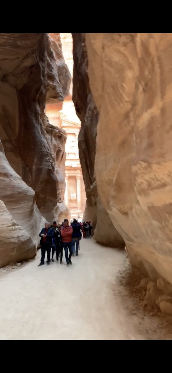 佩特拉的本是座山,山石都是砂岩(类似羚羊彩穴),在阳光照射下会呈现粉,红,橙,白色的条纹。走过长长的峡谷这座宫殿突然出现在拐角处,真的令人头晕目眩,叹为观止。