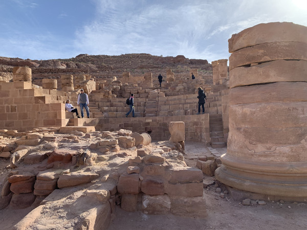 罗马式圆形剧场。人民群众的精神生活相当丰富了。公元363年佩特拉发生了一次地震,剧场被震塌了。罗马人到处修这种露天剧场,以弗所有,亚历山大港有,佩特拉也有。依山而建,有几十层座位,完全由石头凿出来的剧场,而且妙得很,半圆形弧度的设计,遵循acoustic的原理,有如whisper chamber。从我站的这个舞台中心喊一嗓子,回音绵绵不绝,有天然的放音效果。