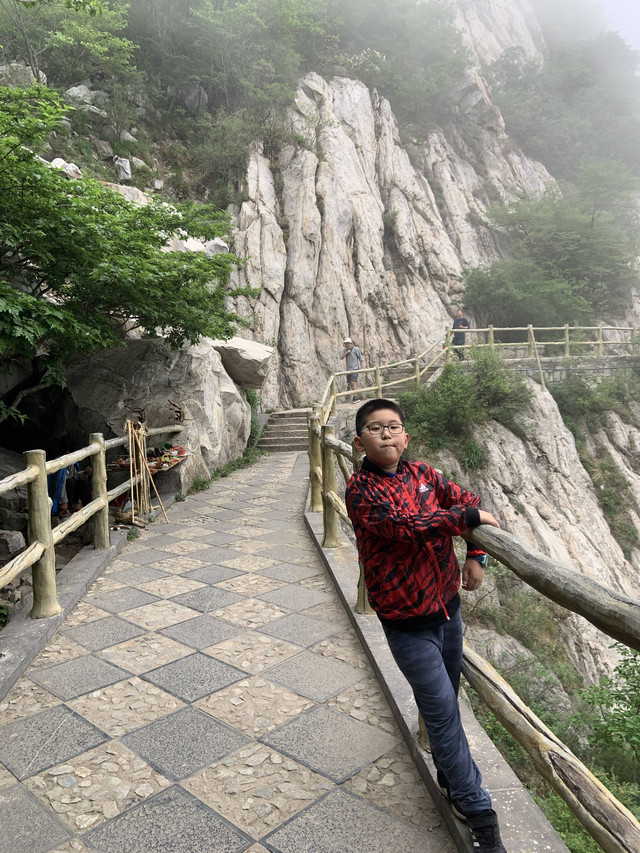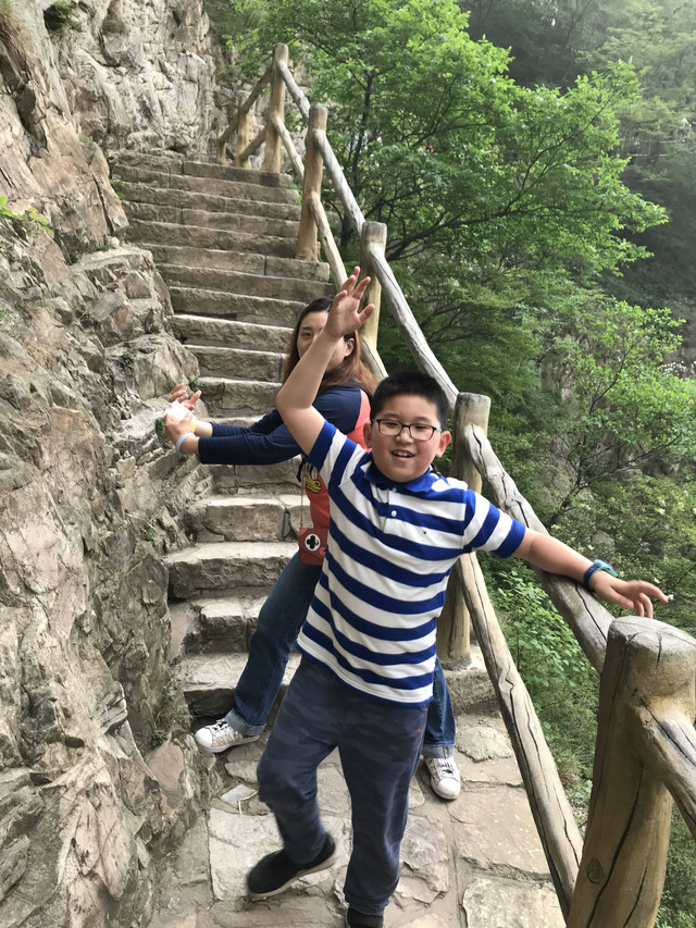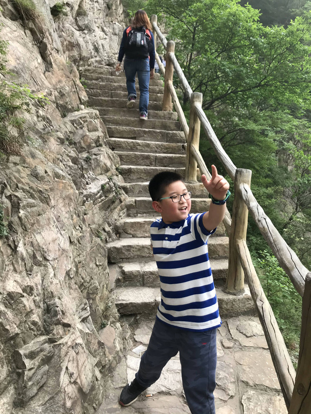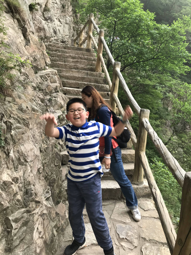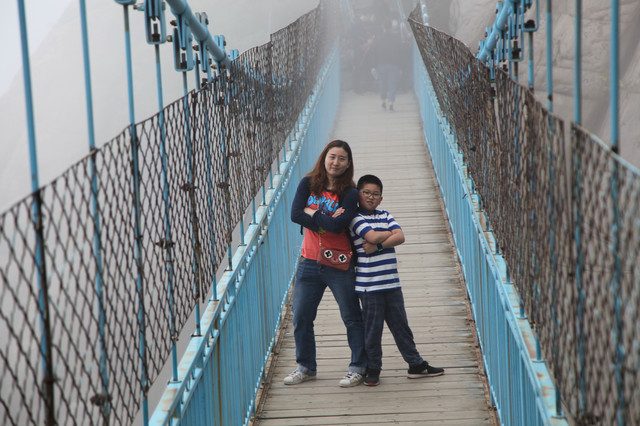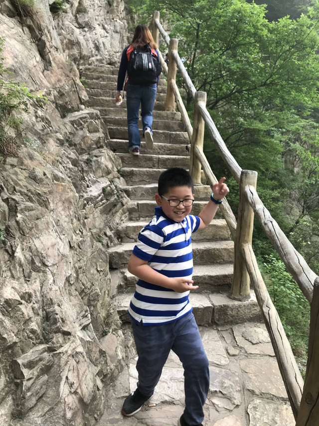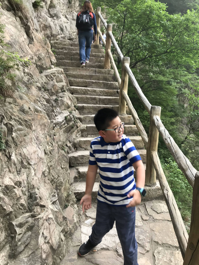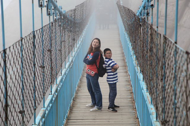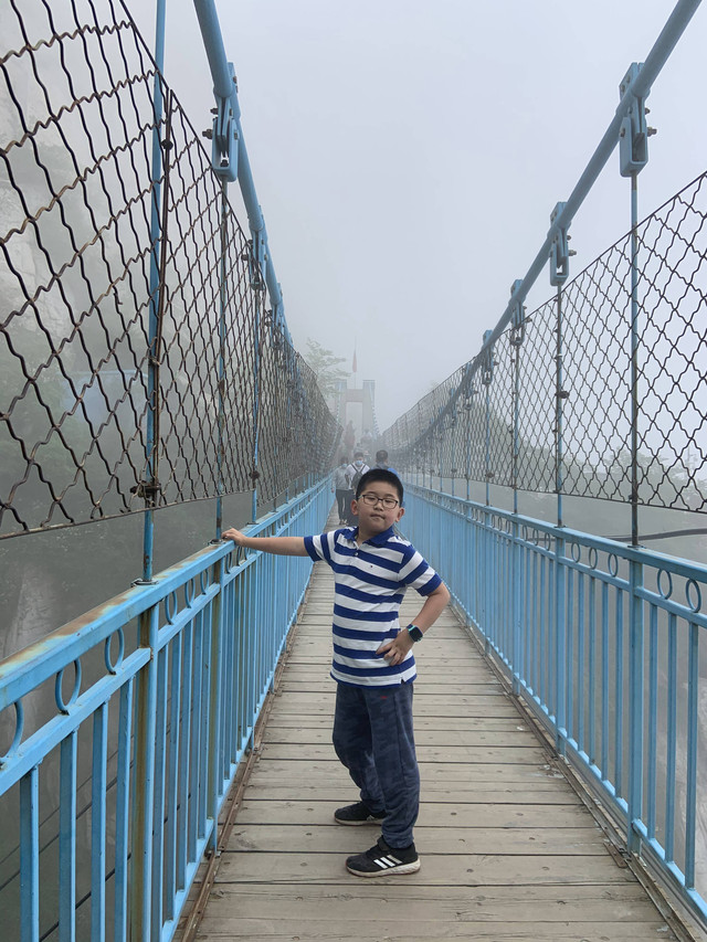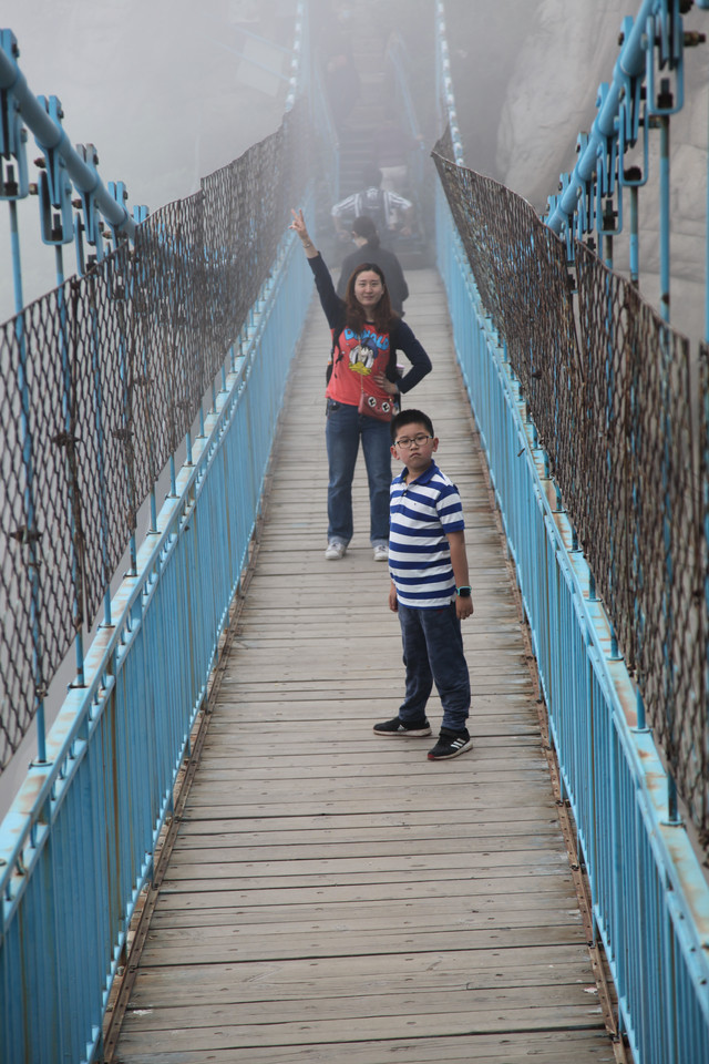 走到索桥,再往上不远处就是三皇寨了。眼见云雾依然不褪,我们就此打住,不打算继续前行了。正站在索桥对岸稍事休息时,有个郑州孩子,过来和我们家龙太子聊天,问龙太子的手表是什么型号的,并大方提出要加龙太子为好友。于是,两个孩子交换了手机信息,添加为好友了。