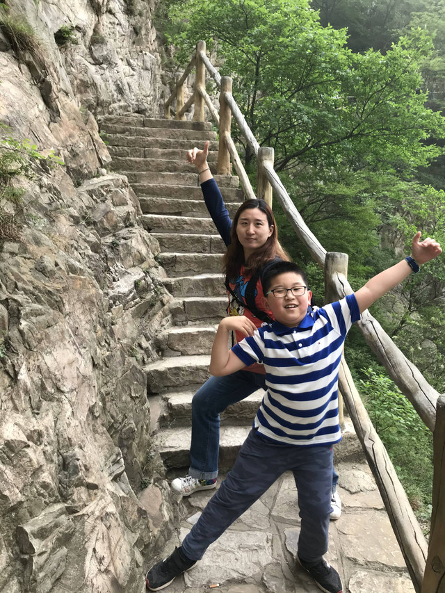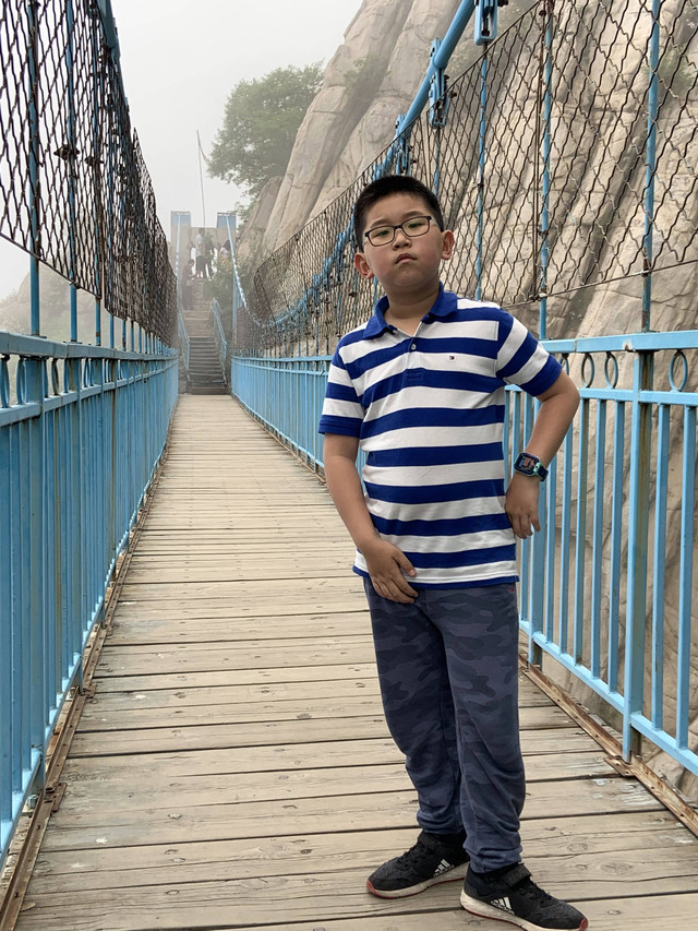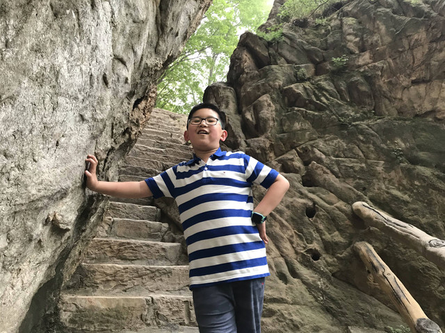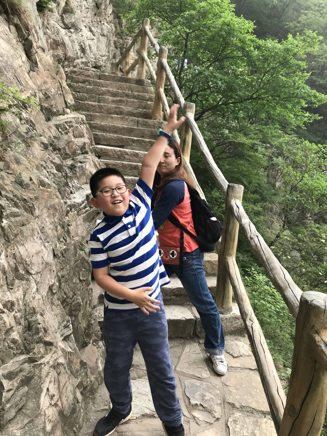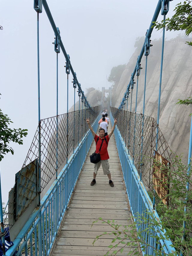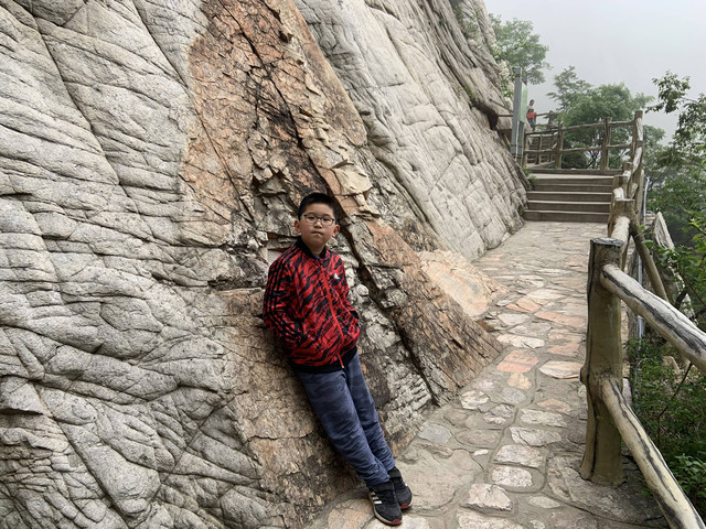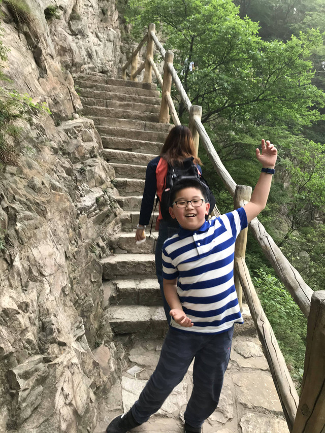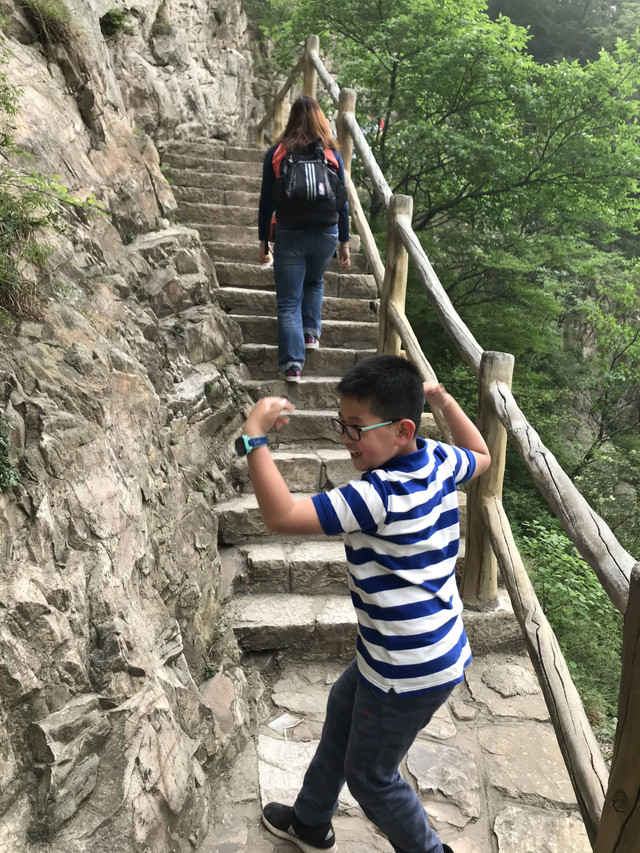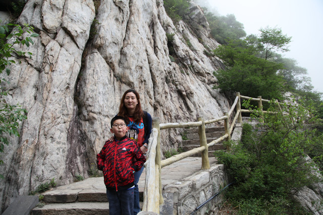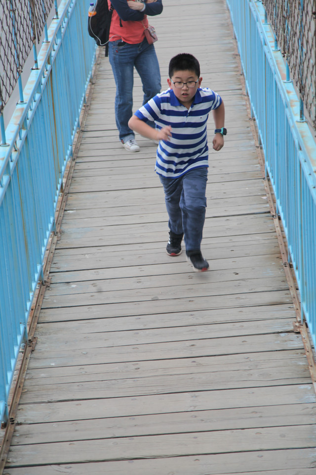走到索桥,再往上不远处就是三皇寨了。眼见云雾依然不褪,我们就此打住,不打算继续前行了。正站在索桥对岸稍事休息时,有个郑州孩子,过来和我们家龙太子聊天,问龙太子的手表是什么型号的,并大方提出要加龙太子为好友。于是,两个孩子交换了手机信息,添加为好友了。