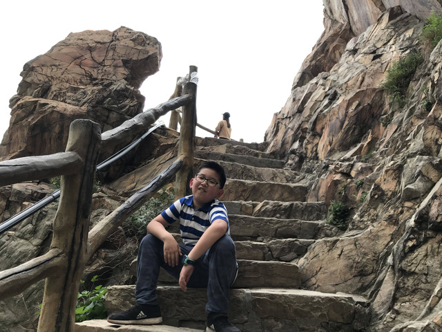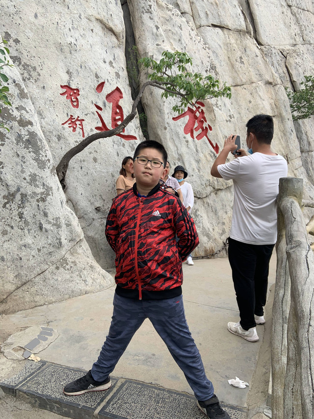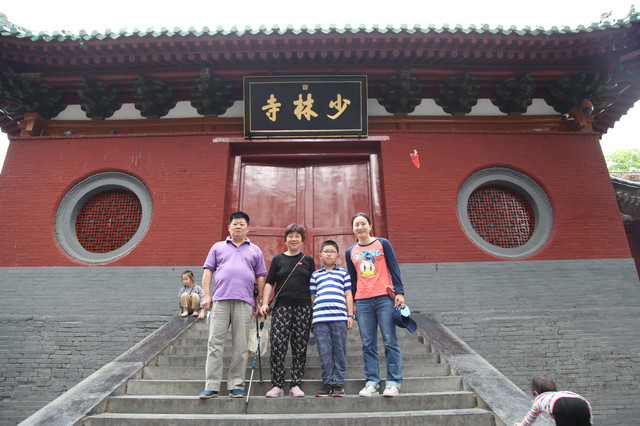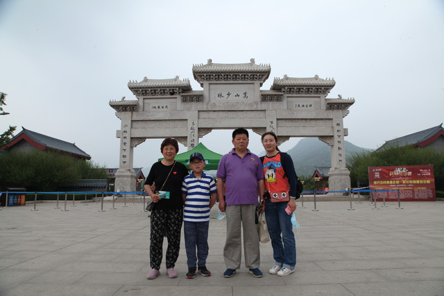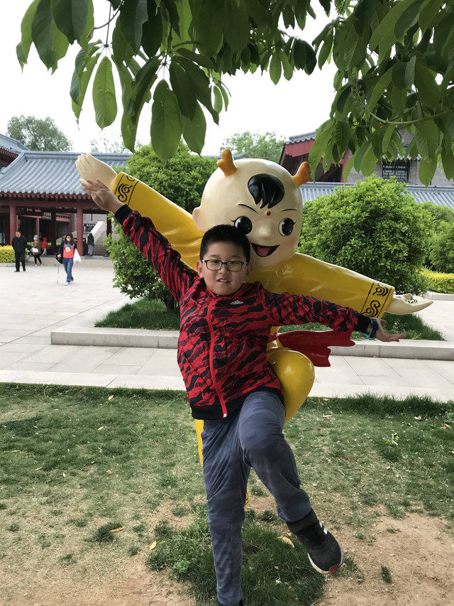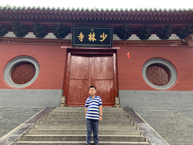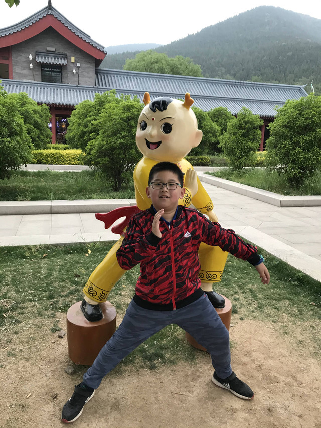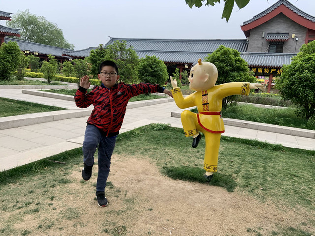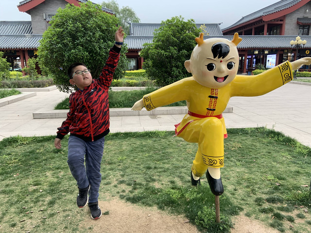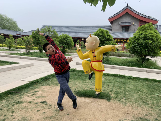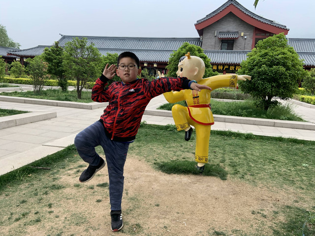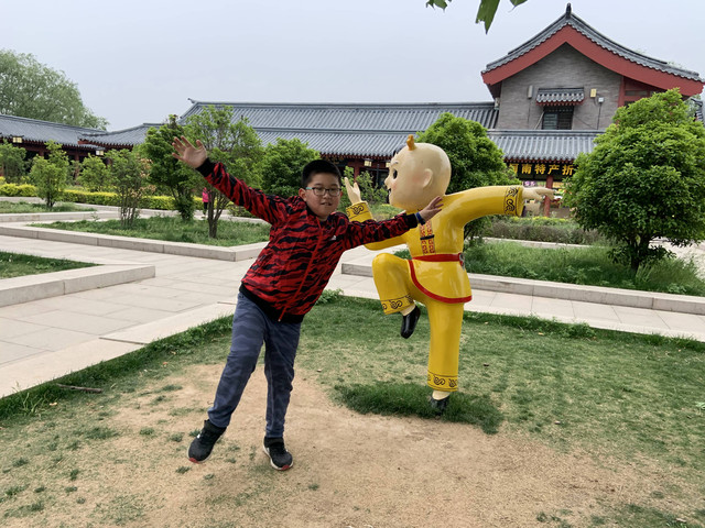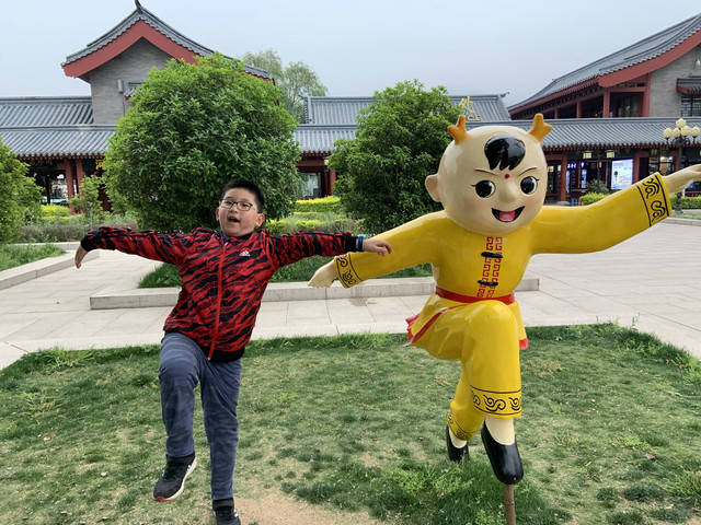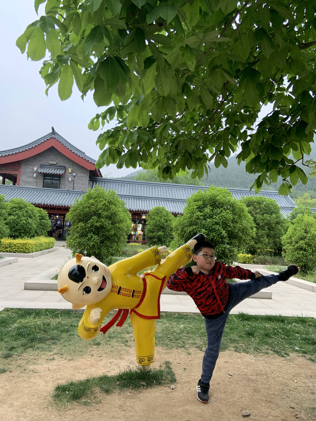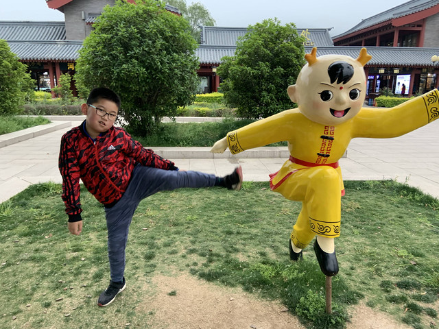 少林寺出口陈列着十几个童子习武的石像,我和娘子像发现了少林寺绝世武功似的,高兴地拉着儿子摆POSE拍照,龙太子悟性很高,很多照片姿势模仿得惟妙惟肖,有合练亦有对练,生动逼真。