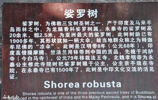 这棵娑罗树本不种植于此。这棵树是印度高僧带到中国的贡品,本植于白马寺,又植于法王寺,但因娑罗树是热带植物,故在两地均不生长。后被北魏孝明帝赐予永泰公主植于当时的明练寺,不料这娑罗树却在此茁壮生长,枝叶蔽天成为参天大树,距今已在此处生长1500年。