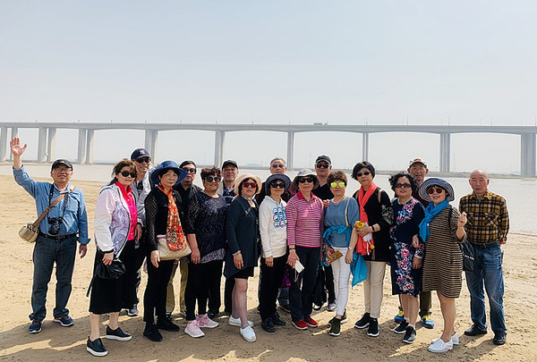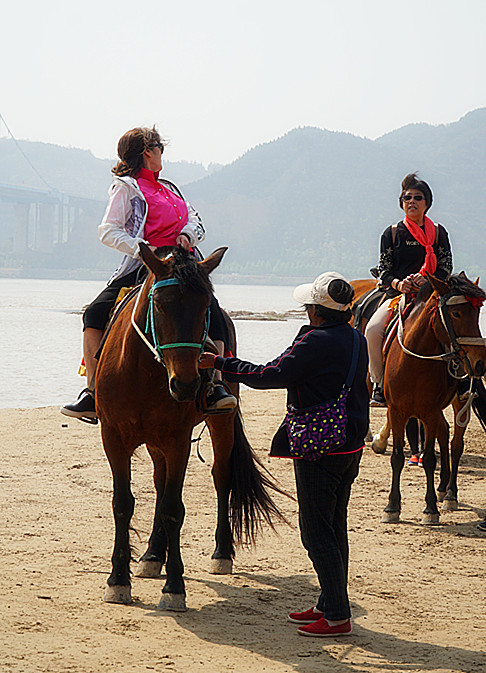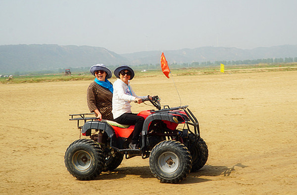 4月18日 上午游览黄河风景名胜区,乘气垫船去黄河兜风。水位不高,河中央有一大片黄沙地,我们的女同胞威风不减当年,骑马、开车,英姿飒爽。