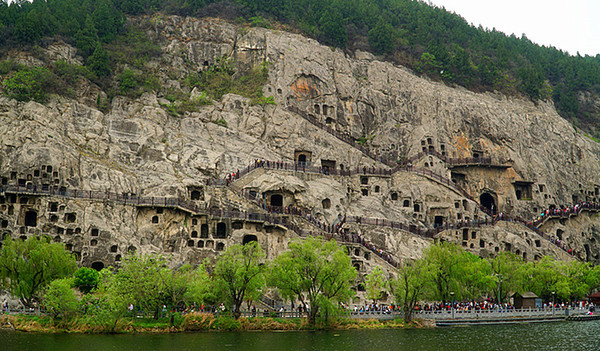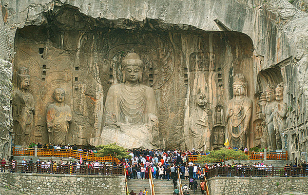 石窟位于香山与龙门山,伊河从两山之间穿过,龙门被称为伊阙。当年,隋炀帝远眺伊阙,感叹地对随从说:这不是真龙天子的龙门吗?古人为什么不在这里建都呢?一位大臣说:古人非不知也,只是在等陛下您呢!这就是拍马艺术的一个经典故事。