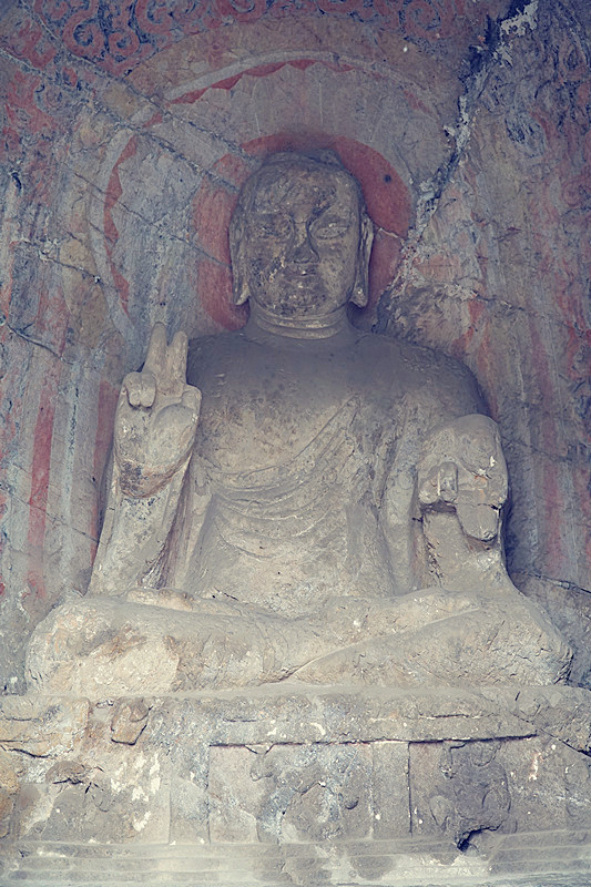 龙门石窟在上世纪三十年代那个动乱的岁月,曾经被洛阳、北京、美国的大盗疯狂盗窃,在石窟中留下了许许多多的空位。现存窟龛2345个,佛塔70多个,碑刻题记2800余块,造像近11万尊。其中有一尊佛像,右手举起三个手指(现在少了一个手指),左手伸出两个手指,好像在说:许个愿吧!