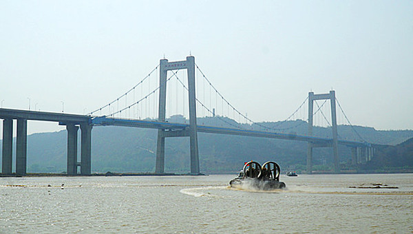 ▲全速前进的气垫船正在穿越黄河大桥