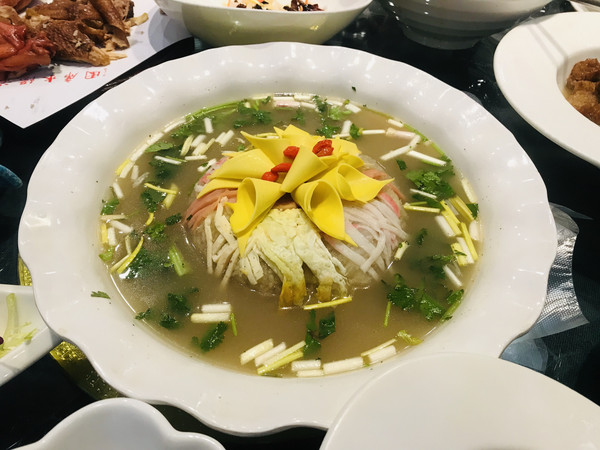 晚上,在水席园吃洛阳著名的水席宴。第一个菜叫“牡丹燕菜”,相传是武则天创造的。水席宴的菜都是汤汤水水,而且上一道菜,就要撤前一道菜,如行云流水。不过,要上一道撤一道菜,我们怎么来得及吃呢?从我的角度,水席宴味道不错哦。