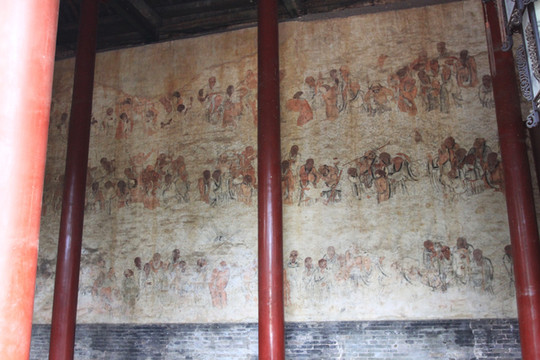 西方圣人殿内的壁画非常有名,是少林寺壁画中的珍品。大殿背面及东、西两墙壁上都绘有彩色壁画,最著名的有“十三棍僧救唐王”、“五百罗汉毗卢图”,色彩艳丽、构图和谐,衣袂飘飘,展示了唐代壁画的高水准。