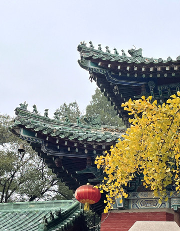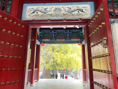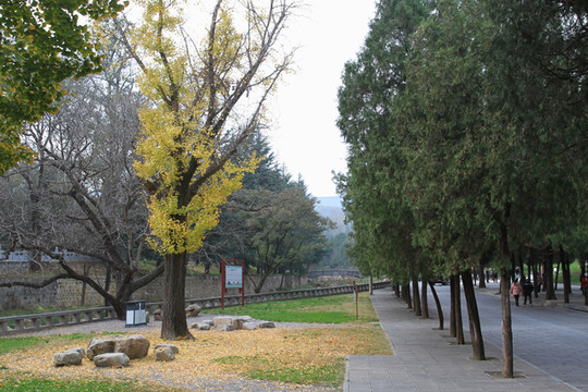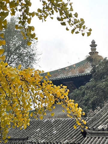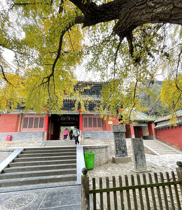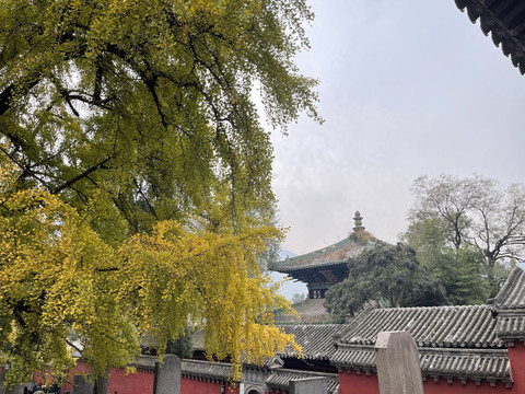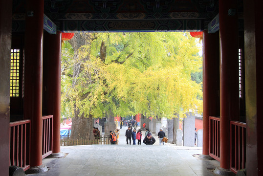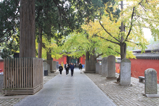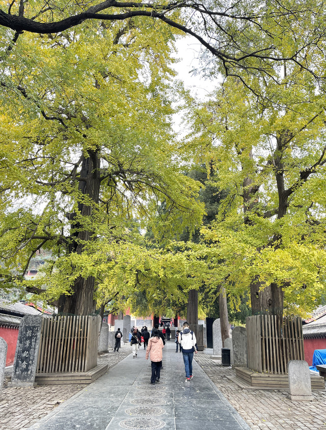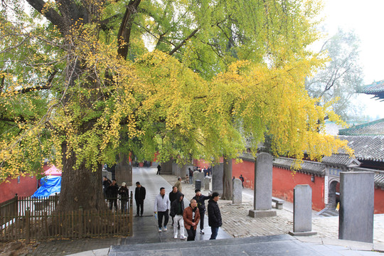 山门前甬道旁,古木参天,有的树龄已经1500年。银杏树叶大部分已变黄,让少林寺秋色更添靓丽。