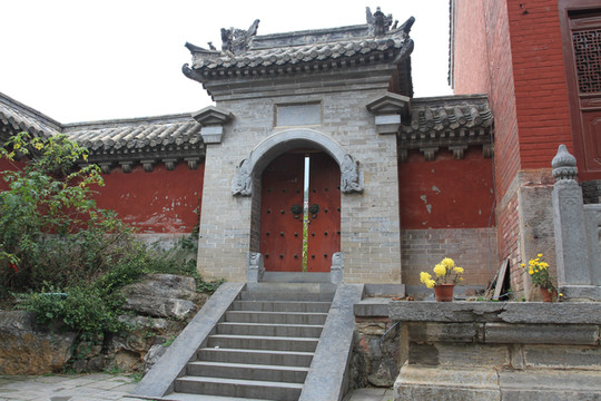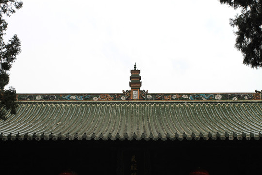 山门由正门与东、西二掖门组成,单檐歇山式建筑,屋顶上覆以黄绿色琉璃瓦顶,正脊用龙纹花脊,两端饰龙吻,中间饰龙首、狮子驮宝瓶脊刹,重脊、戗脊也各用花脊与垂兽、走兽等,皆为高浮雕彩色琉璃。