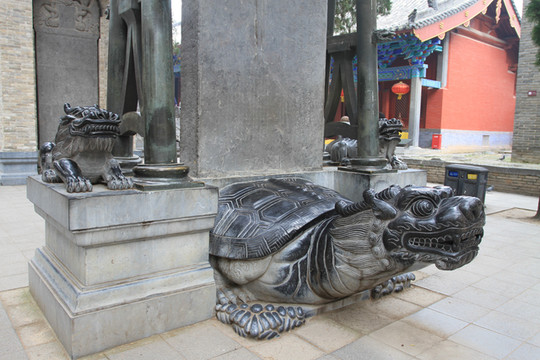 鼓楼前矗立一通石碑,下卧巨龟(赑屃)上置屋顶,旁有带雕饰的立柱,甚为别致。