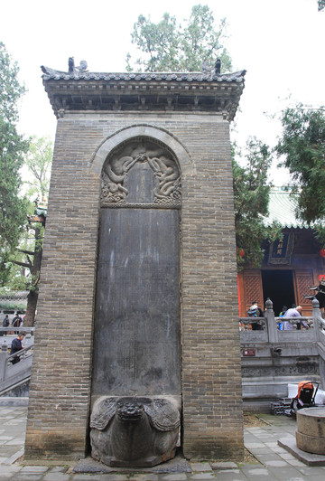 皇唐嵩岳少林寺碑,俗称李世民碑,该碑立于唐开元十六年(728年),碑首雕盘龙,额刻唐玄宗所书的“太宗文皇帝御书”隶书七个字,银青光禄大夫、吏部尚书裴凗撰文并书丹。