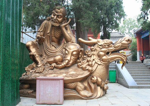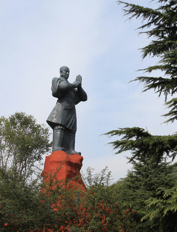 一座高大的僧人塑像,双手合十,迎接着八方来客。