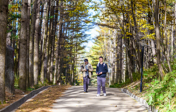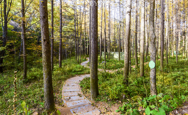 天然氧吧空气鲜,落叶松林供氧源;双眸环顾赏美景,沙路漫步享安闲;