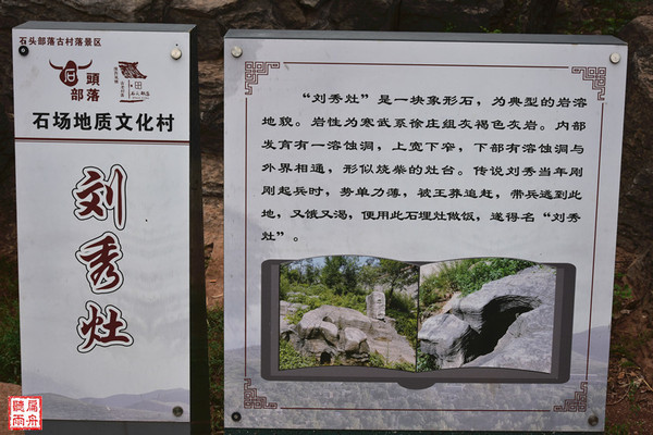 刘秀喝了水,又闷头往前跑了一气,已经饿得受不了了,就坐到一处石头坡上喘息,忽然发现,脚下的石头形如一个灶台,正好可以埋锅造饭。刘秀看看身后很久已经没有了追兵,就向村里人讨来锅和粮食,在这里生火做饭,吃了个饱。如今,这块象形的石头引来了不少游人的围观。