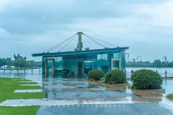 月湖美术馆坐落在月湖雕塑公园的秋岸,这是一座全景落地窗的圆形建筑,从远处看去,几乎和大自然都融为一体。