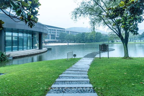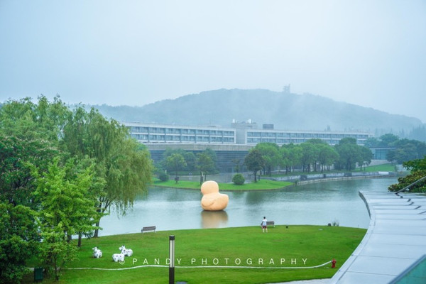 沿着酒店主建筑一路慢行,会惊叹于佘山茂御臻品之选酒店超大的花园,一片宁静的湖水,倒映出了酒店建筑与四周宁静的山谷。不远处还有一只大黄鸭,憨态可掬,和酒店亲子的氛围结合的相得益彰。