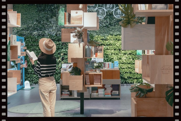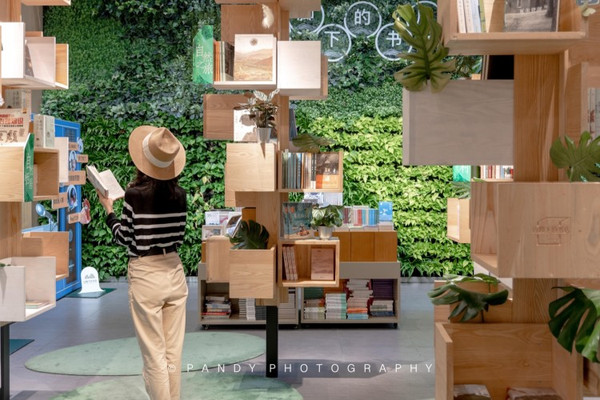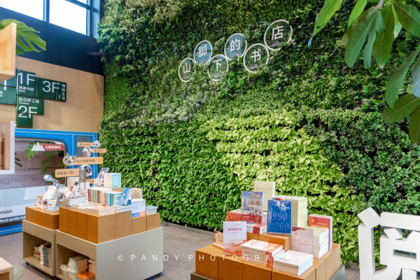山脚下书店,这名字起的真好,毕竟对于上海这样仅一座山的城市而言,这里成为了独一无二的所在。刚一进门就被“树林”与植物墙的结合吸引了视线:一边是从一楼延伸到二楼的植物墙,书店的名字赫然“漂浮”在墙上;另一边是一根根仿佛树木一般的书柜,它们共同组成了一片“树林”。