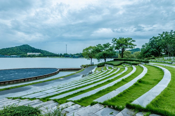 首先来到的春岸,这里是游客服务中心的所在地,出发前可以拿一份地图导览哦。穿过水幕桥,整个月湖印入眼帘,在春岸边有不少青少年在练习羽毛球,这样的环境确实是室外活动的极佳选择。