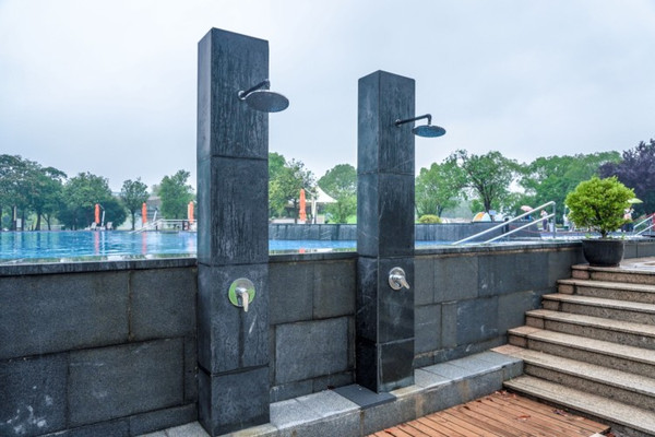 穿过水上石板路就来到了酒店的室外泳池区域,这里总共有大小不同的三个泳池,其中一个是儿童池,还有一个类似无边际泳池。