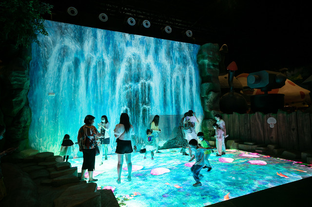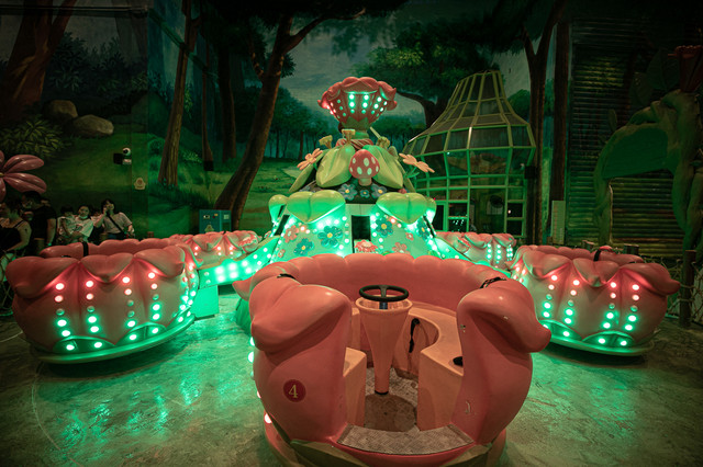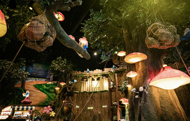 进入这里就是来到了真正的蓝精灵家园,彩色的瀑布、可爱的蘑菇灯、巨大的花朵小草,一切都显得那么梦幻、神奇。