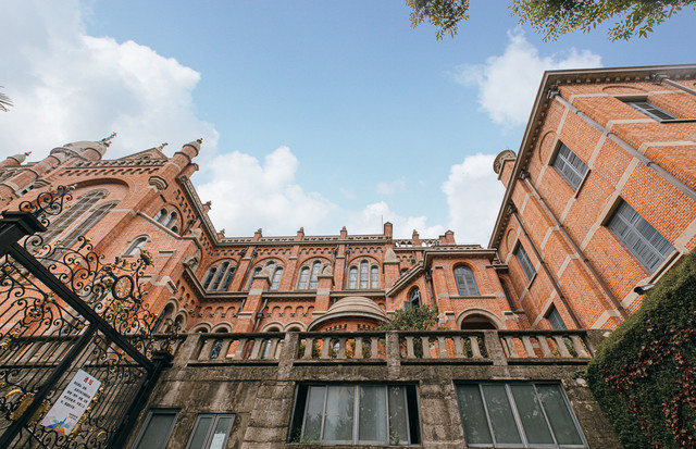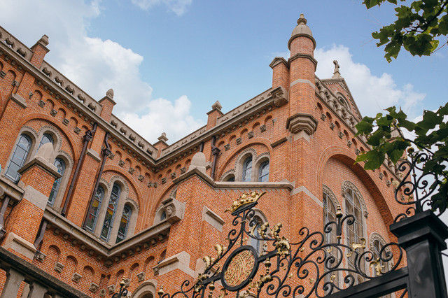 虽然不能进入教堂内部参观,但宏大雄伟的外观也非常棒。哥特式的尖顶、以色列式的橄榄形钟楼、西班牙式的小圆顶、还有希腊式的廊柱,但琉璃瓦和清水壁又是中式风格,多样的文化融合出了不一样的风采,让天主教堂显得如此不一般。