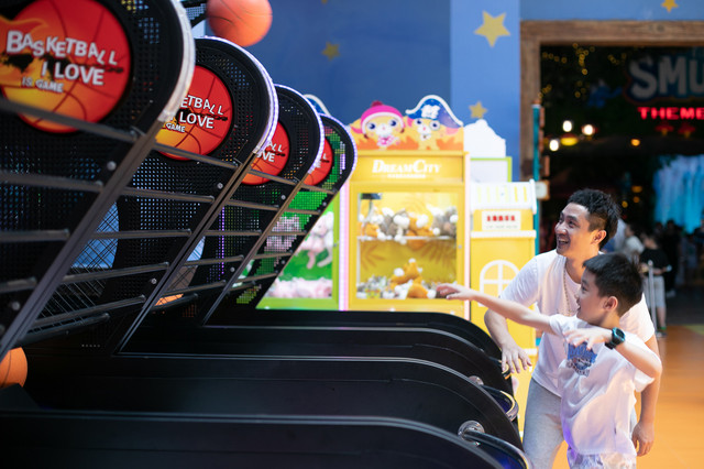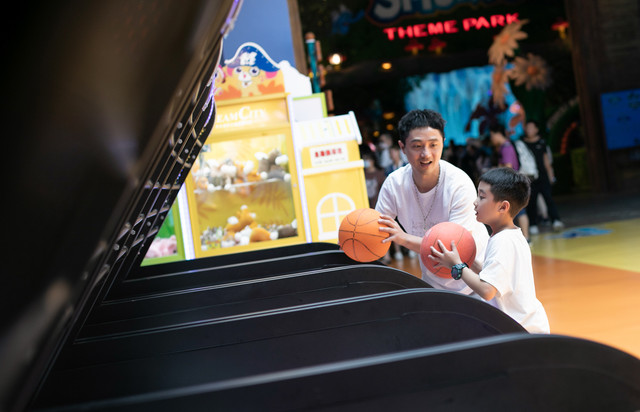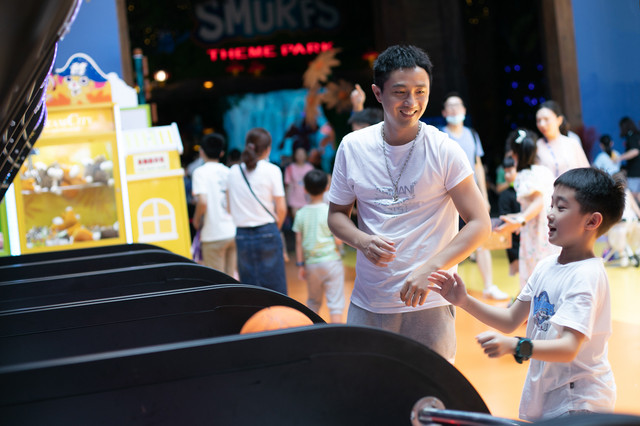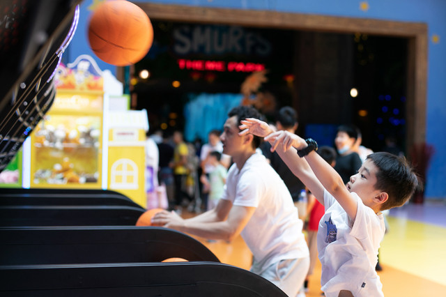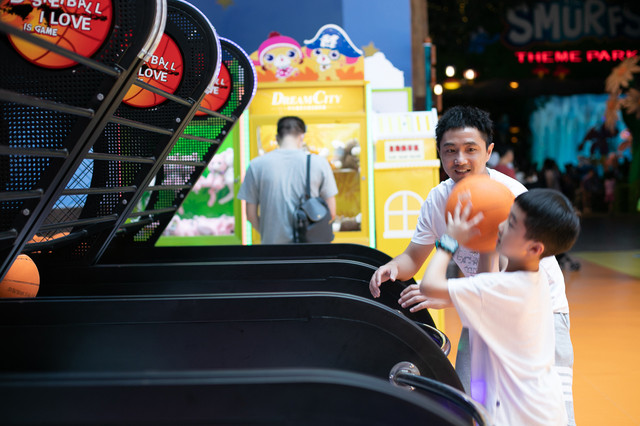结束黑暗实验室的旅程,终于到了老爸我大显身手的时候了,蓝精灵乐园里的设备都很新,性能良好,玩起来非常顺,投篮机这里就看我如何百发百中了。