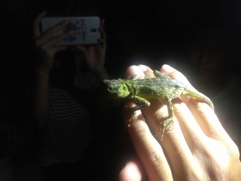 第二站我们钻进森林。第一个动物是寄居蟹,它是个租房户,我看的这只运气好,找个海螺的壳当家。小苏讲由于现在游客留下的垃圾增多,也有的蟹用旧杯子破罐子当家的,还从手机里翻出很多这样的照片,看的让人很不舒服。第二个动物是小白蜗牛,第三个动物是一种竹节虫,和树枝几乎一模一样。对于这些小动物,小苏都是很呵护的感觉,告诫大家除了拍照外不要做任何干扰。随着我们往森林里走得越来越深,小苏在前面模仿小猫头鹰的叫声越来越频繁,忽然小声对大家说:“看,就在上面,不要直接照它!”果然,顺着他的手指看去,原来就是一只小小的猫头鹰,就象成年人的手那么大,轻盈的立的枝头,以自己的方式在和小苏交流,向大家展示够了就轻轻的飞开了。