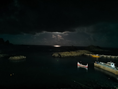 回去的路上下起雨来,看天上的月亮在云中时隐时现。在海岛上远望时,觉得世界很小,天边就在不远的地方。月亮就象挂在天上的一盏灯。躲在云里时,象手电一样射出光柱,在海面上照出一个大圈;云散时便有光柱斜洒在海面上,照亮岸边的船,而在静谧的海中,船就象画中一样颜色分明,没有杂色,看久了竟然产生幻觉,好似眼前的一切伸手可及,把这片幕布拿开,后面便是新的一天。