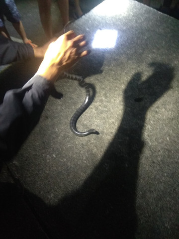 第一站是海边看海蛇。据说这种白黑相间的海蛇的毒性在世界前五位的,差不多是见血封喉的水平。小苏在珊瑚坑边等了一会儿就抓了一条,拿着蛇尾,小心翼翼地一边躲着蛇头的攻击,一边给大家展示一边讲课。讲完问大家,要是谁敢拿可以试一下。我跃跃欲试:“万一咬到有解药没?”。“没有”。“那不小心咬到你怎么办?“他自嘲起来:”我是干这个的,没办法,咬就咬了呗!“看着他的说法就是在吓唬人玩,但在老婆和女儿的劝说下,我终究没敢拿。